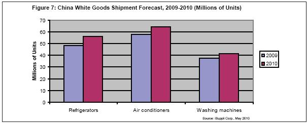 iSuppli公司预测,由于市场普遍乐观,且中国政府采取鼓励性政策,预计2010年冰箱、空调和洗衣机的国内出货量将取得两位数的增长率。在全球经济衰退之后,其它地区市场均受到冲击,但中国白色家电市场2009年受冲击程度没有当初担心的那么大。白色家电最早是指白色的家电产品,当然现在已有其它颜色。