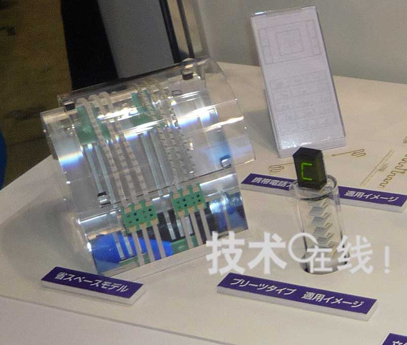 此外,还展示了将底板制成与设备缝隙一致的形状,从而易于封装并可有效利用缝隙的实例。展出了将封入了天线的底板切成圆形,以及与手机外壳形状相同的底板。