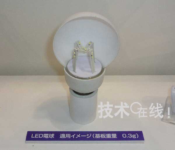 作为应用立体布线的例子,Mectron还展出了LED灯泡的试制品。通过在立体底板上封装朝向多个方向的LED???/a>,可以扩大光照射范围。如果在布线层之外再加上散热用厚铜箔,则LED模块散热也会变得很容易。