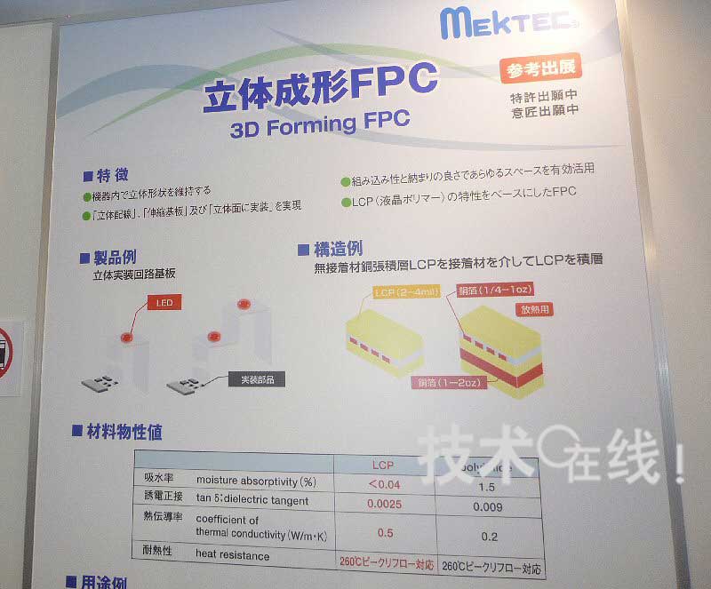 日本Mectron可立体成型的柔性底板“立体成型FPC”在“JPCA Show 2010”(2010年6月2~4日)上参考展出。该底板由热可塑性液晶聚合物和铜箔构成,形成希望的构造并加热后冷却,可以保持其形状。预定在2010年度内完成技术开发,2011年度开始量产。