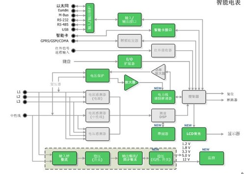 安森美半导体应用于智能电表的方案包含一系列标准产品、专用标准产品(ASSP)及专用集成电路(ASIC),可以提供智能电表的4种基本功能,包括:电源/电源管理、计量、寄存及通信。图2是由安森美半导体的多种器件(图中绿色部分)构成的智能电表应用。
