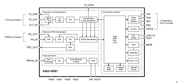 AMIS-49587符合IEC1334标准,有助于简化设计、降低开发及应用成本,并加速上市进程。该器件基于ARM7TDMI处理器内核,包含物理接口收发器(PHY)和媒体访问控制器(MAC)层,而大多数竞争方案都需要复杂的嵌入式软件来执行与AMIS-49587相同的功能。该器件采用扩频型移频键控(S-FSK)调制技术,结合精确的滤波,为长距离电力线提供可靠的低数据率通信,以及2,400 bps(波特)的半双工可调节通信速率。不到20千赫(kHz)的低工作频率配以自动中继器(repeater)功能,令通信更可靠,通信误差比其他及现有方案更低。图3是AMIS-49587的方框图。