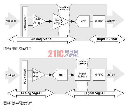 现今,许多商业现成可用(COTS)组件都含有上述隔离实现技术之一。对于模拟I/O通道,您可以在模数转换器(ADC)完成信号的量化处理之前(模拟隔离)或之后(数字隔离)在设备的模拟部分实现隔离功能。根据您的隔离实现在电路中位置的不同,您需要依据其中的一种技术来设计不同的电路。您可以基于您的数据采集系统性能、成本和物理需求,选择模拟或数字隔离技术。图6a和6b展示了实现隔离功能的不同阶段。