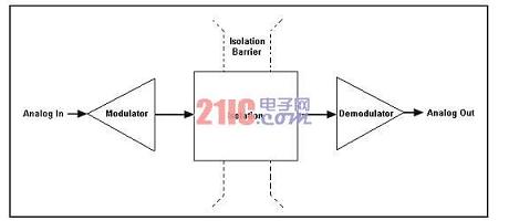 在一个理想的隔离放大器中,其模拟输出信号与模拟输入信号完全相同。图7中标记为“隔离”的部分采用了之前章节中讨论的技术(光耦合、电容耦合或感应耦合)之一,以跨过隔离层传递信号。调制器电路为隔离电路对信号进行预处理。对于光学耦合方法,您需要对该信号作量化处理,或将其转换为变化的光强。对于电容耦合方法和感应耦合方法,您需要将该信号转换为变化的电场或磁场。然后,解调器电路读入隔离电路的输出,并将其转化回最初的模拟信号。