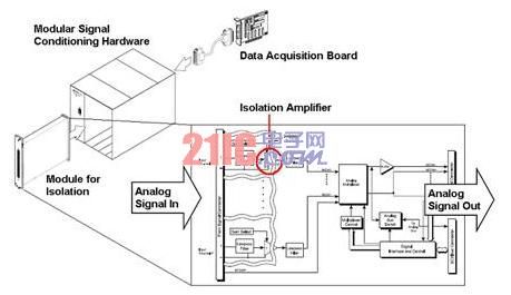 隔离放大器一般用于在数据采集设备的模拟前端中提供隔离功能。图6a中的“隔离放大器”表示一个隔离放大器,在大多数电路中,它是模拟电路的前件之一。来自传感器的模拟信号被传递至隔离放大器,该放大器提供隔离功能并将信号传递至模数转换电路。图7表示了一个隔离放大器。