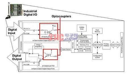 光耦合器,即基于光耦合原理的数字隔离装置,是最古老也是最常用的数字隔离方法之一。它们可耐高压并提供对电气噪声和磁噪声的高抗干扰能力。光耦合器常用于工业数字I/O产品中,如NIPXI-6514隔离式数字I/O???如图10所示)和NIPCI-7390工业运动控制器。