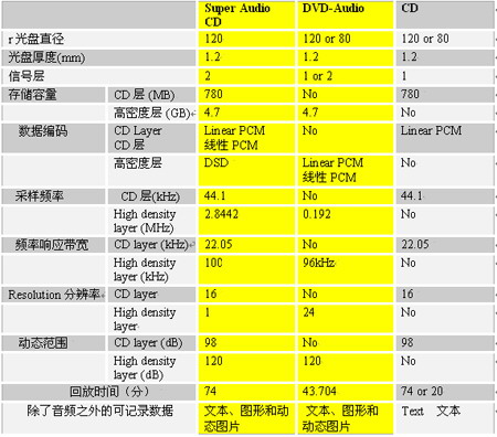 DVD-Audio格式采用了线性PCM编码方法,与目前CD格式采用的一样,但最高采样频率提高到192kHz,动态范围也增加到24位。作为对比,DSD格式采用了一个称为直接数字流(DSD)的编码技术,其最高采样频率为2.8224MHz。DVD-Audio盘和SuperAudioCD盘能够承载高达6个声道的环绕声信息。SuperAudioCD系统还包括一个称为DirectStreamTransfer的无损编码方法,它可以将光盘上的数据减少一半,它使得单个高密度层就可以同时容纳一个多声道和两声道程序。在回放时,数据的恢复理论上不损害数据完整性。DVD-Audio也有一个称作Meridian)的无损压缩方案,它执行一个类似的数据压缩处理。?LosslessPacking(MPL