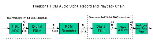 数字音频的最常见数据格式是脉冲编码调制(PCM)。CD使用以44.1kHz采样频率录制的16位PCM数据,DVD-Audio盘也使用PCM数据格式,因此用来处理DVD-Audio数据的技术与CD是一样的。典型的系统架构如下图所示。注意:在sigma-deltaDAC之前,有一个数字滤波器用来处理过采样和防止图像抖动。