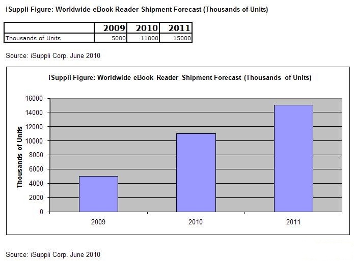 短期内,当电子书阅读器的价格压低到iPad起始价格点的一半左右时,可能会吸引消费者购买电子书阅读器。不过,长期来看,电子书阅读器仍可能有着比最初预期的更多利基。iSuppli预测,全球电子书阅读器出货量在2010年将达1,100万部,2011年还可望成长120%,达到1,500万部。