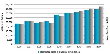 iSuppli公司估计,2009年中国的半导体销售额中,有52%是通过分销渠道实现的,相当于257亿美元。2009年分销商销售额比2008年增长7.6%,而原厂直销额则下降了4.6%,一个主要原因是一些主要采取直销方式的领先供应商在2009年销售额下降。但在未来五年,半导体原厂在中国将提高直销比例。