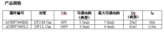 AUIRF7648M2 和 AUIRF7669L2 是 IR为 DC-DC 应用量身定制的首款汽车级 DirectFET® 器件,提供低栅级电荷和导通电阻 (RDS (on) ) ,有助于将各种开关应用的开关和传导损耗降至最低。此外,由 DirectFET® 功率封装提供的低寄生电感可以实现非常出色的高频开关性能,并可减少波形振铃,从而有助于限制电磁干扰和减小滤波器尺寸。