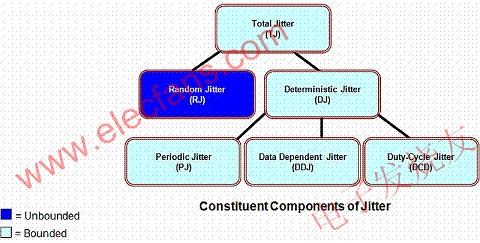 在这种分级结构中,首先将总抖动分为两类:随机抖动和确定性抖动(Dj),然后再将确定性抖动分为若干类:周期抖动(Pj,有时也称正弦波抖动或Sj)、占空比抖动(DCD)以及数据相关抖动(DDj,也称符号间干扰ISI)。有时也会加入另外一个类别,即有界不相关抖动BUj。