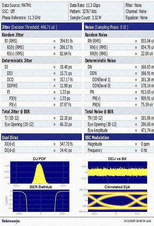 目前市面上性能最好的一款FPGA是数据率为11.3Gbps的AlteraStratixIV。图5所示的测试报告,根据高性能采样示波器采集的数据生成,当Tj为22.18ps时Rj仅395fs。