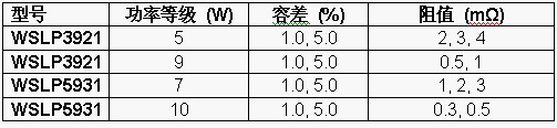 WSLP3921电阻的尺寸为0.394英寸 x 0.205英寸(10.0mm x 5.2mm),最大高度为0.020英寸(0.5mm),WSLP5931的尺寸为0.591英寸 x 0.305英寸(15.0mm x 7.75mm),高度为0.020英寸(0.5mm)。专利的加工工艺使电阻具有0.0003Ω~0.004Ω的极低阻值,以及1.0%和5.0%的严格容差。