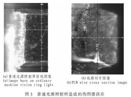 从图中可以清晰地看到,目前的普通光源摄取的图像和真实的截面图有明显的边缘偏差,在2X的倍率下,1像素对应的物面尺寸为1.61μm。伪图像边缘造成的线宽差别超过3像素。使得系统准确度大为降低。该伪图像边缘产生的原因是由于普通光源光线照射角度过小。被厚密线路遮挡大部分光线后,基材和下线宽的亮度和颜色非常接近。而一般的线宽测试中,并没有将该偏差计入测量结果。致使测量值产生一个固有方向的系统误差,也就是说,如果该误差不能被消除,所测得的数据不是真实PCB的线路特征的反映。而该误差并不能通过改变图像的清晰程度和对比度消除,只能依据PCB厚密线路的特点去改变光源的设计来消除或减小该误差。