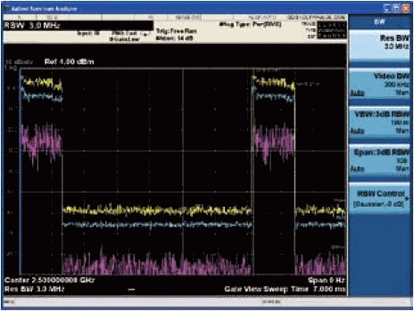 图5图中的信道功率测量仅显示了前导码的选通有了稳定的触发,频谱分析仪就可以启动扫描测量;