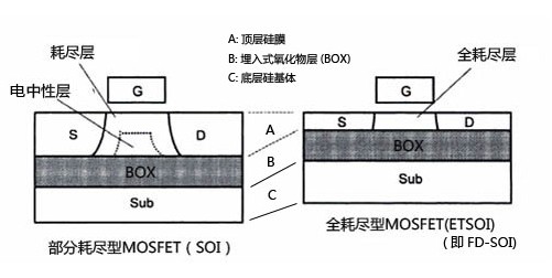 体硅CMOS技术走到22nm之后,特征尺寸已很难继续微缩,急需革新技术来维持进一步发展。在候选技术之中,FDSOI(Fully Depleted SOI,全耗尽SOI)技术极具竞争力。对于FDSOI晶体管,硅薄膜自然地限定了源漏结深,同时也限定了源漏结耗尽区,从而可改善DIBL(Drain Induced Barrier Lowering,漏致势垒降低)等短沟道效应,改善器件的亚阈特性,降低电路的静态功耗。此外,FDSOI晶体管无需沟道掺杂,可以避免RDF(Random Dopants FluctuatiON,随机掺杂涨落)等效应,从而保持稳定的阈值电压,同时还可以避免因掺杂而引起的迁移率退化。