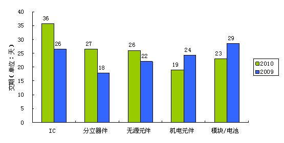 本次调查的结果印证了2010年电子行业所面临的“缺货”困境——2010年电子系统制造商与设计公司面临的最普遍的采购风险是无法供货,43.6%的公司面临着供应商无法供货的困扰。与2009年的调查做对比,2010年IC、分立器件、无源元件、机电元件、???电池五大类物料价格有不同幅度增长,其中IC与分立器件涨幅最大,机电元件、模块/电池涨幅最?。唤换跗诜矫?,IC、分立器件、无源元件交货期都有所延长,而机电元件、模块/电池交货期分别缩短了5天和6天;货款结算期方面,IC、分立器件货款结算期均有所延长,无源元件、机电元件、???电池的货款结算期都缩短了。