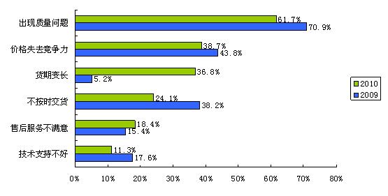 在缺货的大环境下,不少电子系统制造商被迫更换供应商。导致合格供应商降级的最主要因素依次是物料出现质量问题、价格失去竞争力和货期变长。物料质量问题在任何情况下都是不可妥协的;价格失去竞争力也就是价格上涨压缩了下游公司的利润空间;而货期变长导致供应商降级的比例变化最显著,由2009年的5.2%大幅上升至2010年的36.8%——这是供应链调整的表现。因此,系统厂商在考察新供应商时,除了考察物料质量因素外,产品性价比和供货能力也是重要的考虑因素。