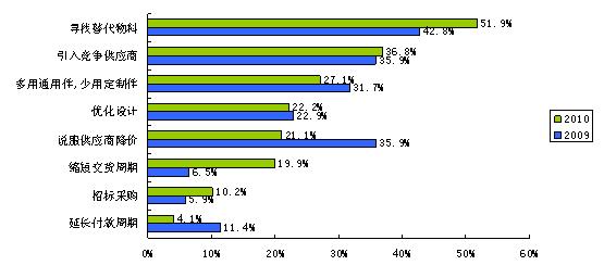 在缺货涨价的气氛中谈COSTDOWN注定是个艰难的过程。调查中显示,2010年最主要的COSTDOWN方式是寻找替代物料和引入竞争供应商。与2009年相比,寻找替代物料依然是最重要的COSTDOWN方式,但采取说服供应商降价这种方式的人少了许多,由35.9%降至21.1%,其中,2亿营业额以上的大公司在砍价方面显然更有话语权。