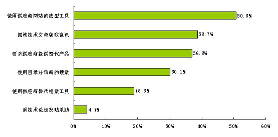 通过对替代方式的调查发现,不同品牌物料之间的替换成为2010年使用替代物料的最主要方式,而2009年的调查结果中厂商新老产品替换占据主流。替代方式侧重点的变化也反映了供应链中物料品牌替换比较活跃,这为新的品牌供应商切入市场提供了机会。那么工程师如何获得品牌替代信息呢?通过调查发现,使用在线工具是寻找物料品牌替代信息成为新宠。在线工具包括供应商网站的选型工具、目录分销商的搜索工具、供应商替代搜索工具。此外,技术文章也是影响工程师选择的重要方式,而技术文章恰恰是国内元器件供应商的短板。