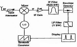 频谱分析仪从频谱测试的实现技术上可分为两类:使用傅里叶变换(FFT)技术的数字频谱分析仪和使用模拟滤波器的模拟频谱分析仪(包括并行滤波器频谱仪和扫频式频谱仪)。数字频谱分析仪使用数值计算的方法处理一定时间周期的信号,可提供频率、幅度和相位信息,对周期信号和非周期信号均能分析。特点是速度快,精度高,适合分析窄带信号。模拟频谱分析仪的扫频式频谱分析仪是目前最常见的类型,在扫频频谱分析中普遍采用超外差式方式。扫频式频谱分析仪可分析稳定和周期变化信号,提供信号幅度和频率信息,适合宽频带宽的快速扫描试验。Agilent的ESA系列经济型频谱分析仪和HP8563等都属于扫频频谱分析仪,其简化原理框图见图1,扫频频谱仪实际上是多级混频结构。这种分析方法最核心的部分是它的混频器和中频滤波器?;炱灯鹘徊庑藕畔卤渲林衅?,然后在中频上进行处理,得到幅度。本地振荡器采用扫频振荡器,它的输出信号与被测信号中的各个频率分量在混频器内依次进行差频变换,所产生的中频信号通过中频窄带滤波器后再经放大和检波,加到视频放大器作示波管的垂直偏转信号,使屏幕上的垂直显示正比于各频率分量的幅值。本地振荡器的扫频由锯齿波扫描发生器所产生的锯齿电压控制,锯齿波电压同时还用作示波管的水平扫描,从而使屏幕上的水平显示正比于频率。