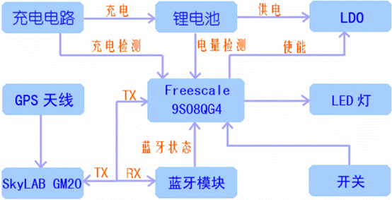 蓝牙GPS??橐彩且桓鲂⌒〉谋阈璞?,需要实现电源的管理、GPS数据的处理、蓝牙状态的判断以及点亮指示灯等功能。这都要求使用一个MCU来协调控制整机的工作。