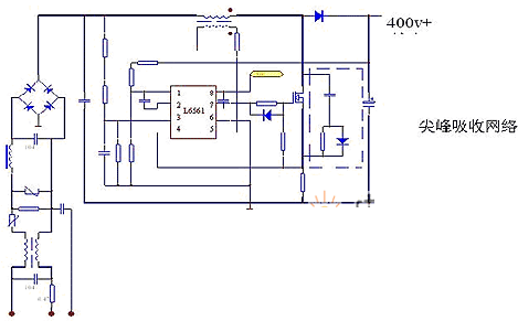 3.在低电压时,MOS 的升压电流更大(PWM 输出导通较宽)MOS 温升较高。这时可将电压范围设定为接近值,例如:120v~260v 时同等负载测试时,可将电感的感量及匝数,按照260v 时的输入值,设定并最大可能减少次级匝数。在120v 时可将输入最低电压设定为110v最大限度增加电感感量,使母线在110v 满载时输出达到额定的400v。在260v 时设定次级是由于输入电压升高,输入电流减小会使次级电压下降,5 脚电流采样失效,使芯片进入重新启动(误以为空载)母线不断脉动的重新启动。110V 调试时感量大,可减少因输入电压低而导致的PWM 频率太高,带来的MOS 开关损耗,感量大时亦可有效减少峰值电流的值。另一减少MOS 温升的方式是并联一路吸收网络。电阻并联高速二极管后在串联一只电容可使MOS 开关时的尖峰反向电压得到有效吸收。(小功率无明显优势)。