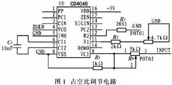 图l为占空比调节电路。该电路是将调节器输出的电压信号作为压控振荡器VCO(Voltage CONtrolled Oscillator)的输入信号,此信号是一个在0~5 V之间变化的直流电压信号,即INPUT信号,由于VCO是一个电流控制振荡器,对定时电容C1的充电电流与从引脚9输入的控制电压成正比,使VCO的振荡频率正比于该控制电压。当VCO控制电压为0 V时,其输出频率最低;当输入控制电压等于电源电压VDD时,输出频率则线性增大到最高输出频率。VCO振荡频率的范围由R1、R2和C1决定。VCO振荡频率由CD4046的引脚4直接输出到CPLD处理单元,CPLD内部通过对该脉冲信号的计数来控制逆变触发脉冲的宽度,来调节触发脉冲的占空比。