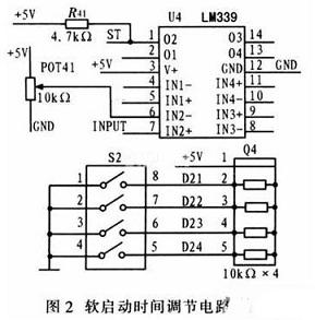图2为软启动时间调节电路。该电路单元是将调节器输出信号作为电压比较器LM339的输入信号,此信号是一个在0~5 V之间变化的直流电压信号(即INPUT信号)。按照设计要求,LM339的引脚6给定电压为1 V,当INPUT信号的电压大于l V时,LM339的引脚l通过上拉电阻输出一个高电平作为启动信号送入CPLD。在CPLD内部通过调节外部的拨段开关控制比较器的输出,从而控制软启动的时间。