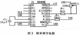 图3为频率调节电路。通过调节CD4046外接电位器POTll,控制VCO输出脉冲的频率,根据设计要求,该电路将输出一个变化范围在1~6 kHz之间的脉冲信号PLS,将该信号作为CPLD的输入信号。在CPLD内部通过计数延时和占空比设计要求,最终输出一个频率在400~3 000 Hz之间符合占空比要求的逆变触发信号,并可通过POT11调节该信号的频率。
