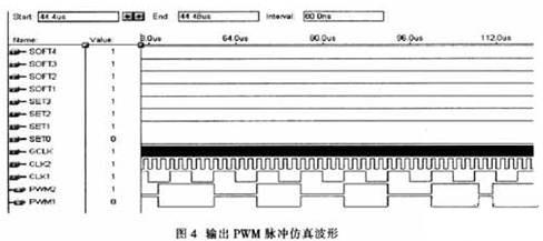 该系统软件设计是根据系统功能要求而设计的,基于EPM7128的软件程序设计分为:输出脉冲占空比调节、频率调节、软启动时间调节和过压过流报警??⑾低呈褂肰HDL语言进行??榛喑?,这样可以提高程序的移植性,缩短开发周期,降低开发成本。而且易于维护系统软件,提高可靠性。图4是输出的两路PWM脉冲仿真波形,其中GCLK是一个基准时钟源,CLKl和CLK2分别是经VCO转换的频率调节和占空比调节信号,SET和SOFT分别是2个外接的4位占空比调节和软启动调节拨段开关。