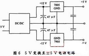 采用DC/DC定电压隔离非稳压模块A0512S-2W,将5 V单电源变换成±12 V,再利用稳压模块变换成±5 V电源,给前两级放大器供电。电路如图6所示。类似地,用定电压隔离??锳0515S-2W,将5 V变换至±15 V电源为末级放大器供电。如图6所示。