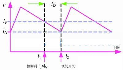 一般而言,通常采用比较器来检测IL是否超出IV,以决定关断或重新开通。可是,比较器会带来延时tD,影响阈值的有效值。如图2所示,比较器在t1时刻检测到IL< p> V,可是偶遇延时tD,开关会在t2时刻被恢复?;谡飧鲈?有效阀值IN便会低于IV,这样,实际的输出IOUT(CL)为: