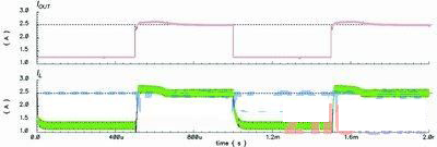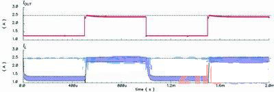 为了说明这个方案,图1中的降压转换器会采用这些配置:L=20mH、COUT=47mF、RL值在2.64W(正常模式)~1.1W(电流限制模式)间转换,并会使用一个tD=100ns的比较器,而IOUT(CL,DES)和IL(RIPPLE)分别是2.5A和0.3A。不过,如果使用传统的峰值电流限制方法,那么式(1)中的IV便会设定为2.35A,传统方法的模拟结果如图4所示。由此可以看到,IOUT(CL)会由于tD的影响而低于2.5A。然而,使用新方法并将ILR设定在2.5A,IOUT(CL)便可如图5所示达到2.5A。于是,传统方法中出现的问题便能够在该方案中解决。