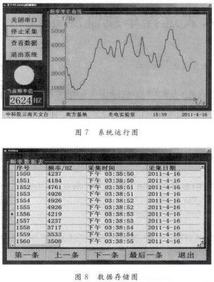 仿真通过之后,就可以按照图3搭建硬件电路来进行硬件的运行测试。在此使用VB 6.0来编写上位机软件,同时配合Access数据库来存储PIC18F452上传的频率数据。系统的运行效果如图7,图8所示。