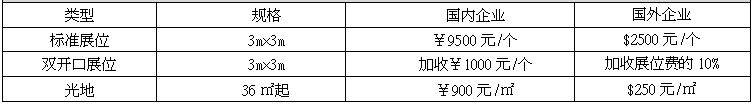 标准展位配备三面围板(高2.5m)、公司楣板、咨询台1张、椅子两把、光管2只、电源插座1个、废纸篓1个;光地不提供任何配置;展位搭建、用电、展具需另行租赁