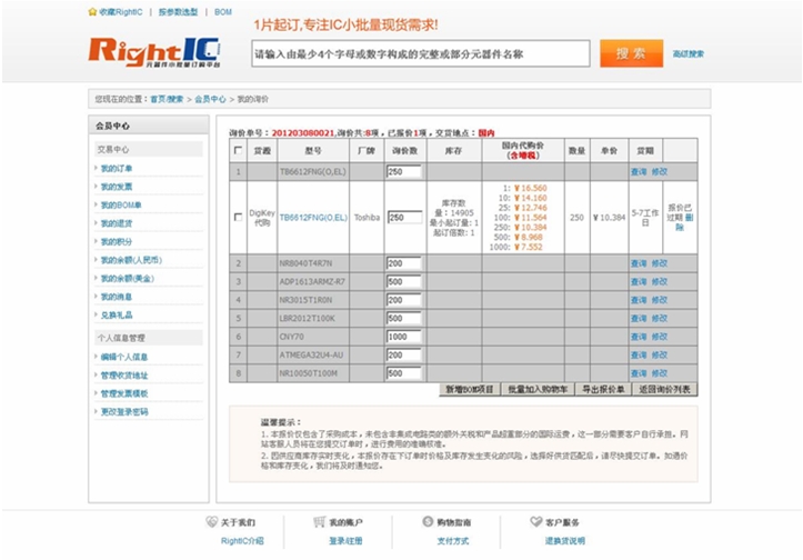 图1:RightIC网站BOM单批量查询功能的询价页面。