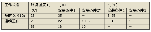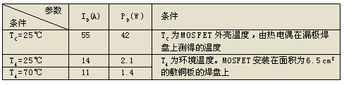 在DC/DC转换器中,MOSFET工作在占空比变化的脉冲状态,但也不是工作于窄脉冲状态;工作温度范围是-40~85℃。表1、表2中无这种工作条件下的ID及PD值。ID可在下面的范围内选取:(TA=70~85℃时的ID)