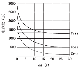 在计算开关管损耗时要用到输入电容Ciss(Ciss=CGD+CGS)或反馈电容Crss(Crss=CGS)值。为减小开关损耗,要选择Ciss或Crss小的MOSFET。Ciss一般为上千到数千pF,而Crss一般为几十到几百pF。“MOSFETT选择指南”或“简略表”中往往没有Ciss或Crss参数,但有总栅极电容Qg值。由于Qg小的MOSFET,其Ciss或Crss也小。所以可先找出Qg小的MOSFET型号,然后再在数据资料中找出Ciss或Crss值。有的数据资料的参数表中无Ciss或Crss参数,但有Ciss和Crss与VDS的特性曲线,可取VDS=15V时的Ciss或Crss值作为计算值,如图5所示。