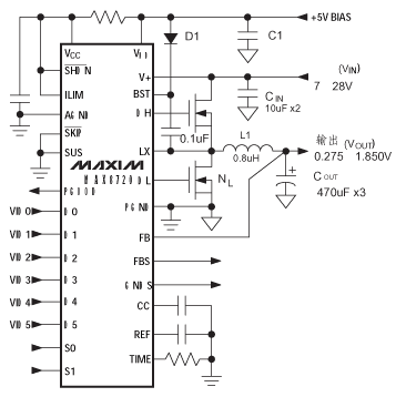由MAX8720组成的降压式DC/DC转换器电路如图6所示。现使用条件为VIN=7~24V、VOUT=1.25V、IOUT(max)=15A、fsw=300kHz,控制器的工作电压(偏置电压)VCC=5V,选合适的开关管(NH)及同步整流管(NL)。
