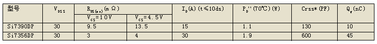 初选Vishay公司的Si7390DP作NH(其Qg仅10nC);Si7356DP作NL (RDS(on)=4mΩ)。其封装都是8引脚、有散热垫的SO-8封装,主要参数如表3所示。