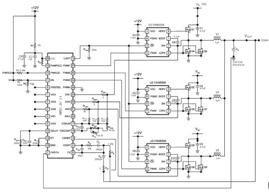 由控制器FAN5019B及3个驱动器FAN5009组成的三相同步整流降压式DC/DC转换器电路如图7所示。现使用条件:VIN=VCC=12V(VCC是供控制器及驱动器的工作电压),VOUT=1.5V,IO=65A(IO即IOUT(max)),fsw=228kHz,选择开关管及同步整流管(采用两个并联组成)。