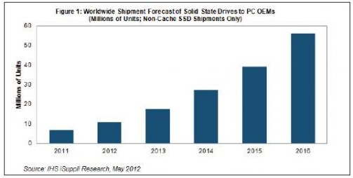 据IHS iSuppli公司的存储市场简报,随着固态硬盘(SSD)的成本下降,以及超级本(Ultrabook)等产品的需求给其带来活力,PC OEM厂商可能会增加使用SSD,从而进一步扩大其出货量。