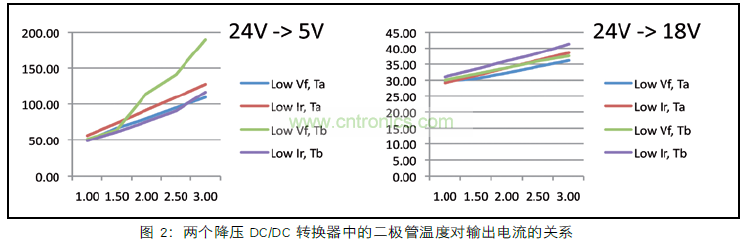 图 2 还清楚地显示输入输出电压比。左图显示低占空比5 V输出的D C / D C 转换器。在较低的占空比时,T2的时间较长,功耗也较高。这反过来使二极管更热,使得Ir增加地更大,因此PT1变得更高。总的结果是:在输出电流增加时,二极管的温度会很快地升高。在电流较高时,温度实际上已经超过了二极管规定的工作范围。在图 2 的右侧,较高的输出电压18V时,它的占空比也比较高,这使得PT2损耗保持在可控制范围内。二极管上产生的热量较少,使得Ir增加的幅度较小,因此,PT1会更少,并且整体温度升高幅度较小。