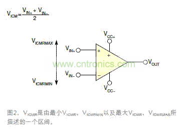 其中,VICMRMIN是相对VCC-电压轨的极限值,VICMRMAX是相对于VCC+电压轨的极限值(图2)。