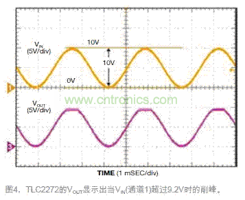 测试电路时,在其输入端加一个直流偏移为VCC电压一半(或5V)的300Hz正弦波。调 节交流幅度,直到看到VOUT有一个变化。当施加10V峰峰值输入时,VOUT显示一个接近正电源轨的削峰信号,而不是接近负电源轨。这个接近正电源轨的不良性能就是预计输入超过9.2V时的结果。对于0~9.2V之间的VIN,VOUT显示和预期一样的正确波形(图4)。