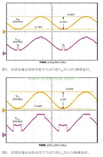 VIN中心在2.5V时,VIN增加到2.7V峰峰值,VOUT都有预期的线性特性。当VIN增加到约3.5V峰峰值时,中心在2.5V,VOUT继续跟随VIN,表现出正确的运放特性。注意这个线性特性好于数据表对VICMR的限制,但仍然超出了保证的极限值。当VIN增加到略高于3.52V峰峰值时,VOUT开始在接近正电源5V轨和负电源0V轨时表现出非线性特性(图5)。VIN进一步增加到4.2V峰峰值,明显超出了VICMR。当输入峰值超过了近正电源轨的极限时,VOUT的信号输出超出电源轨,跳到正电源轨5V以上,并停留在这里,直到VIN回到可接受范围内(图6)。当输入跌到接近负电源轨的极限以下时,VOUT的信号表现出一个相位反转,跳至中轨2.5V,并以一个偏移跟随VIN,直到VIN增加到VICMR内的一个可接受电压值。