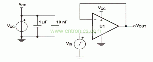 为了更好地理解超出VICMR带来的影响,我们列举出了一些此类违规的例子。我们选择两个不同VICMR规范的运算放大器,以说明这些影响。我们之所以选择这些器件,是因为它们具有轨到轨输出,可排除输出级带来的一些限制。图3所示单电源电压跟随器电路,用于获取两个器件的波形。所有数据均在~25°C室温下的实验台获取。