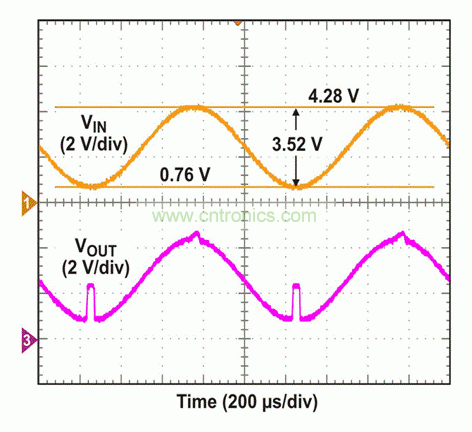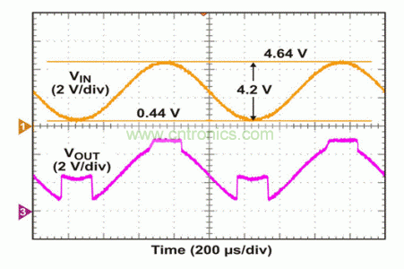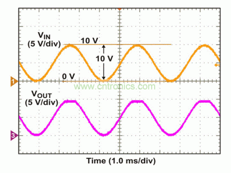 为了测试该电路,我们将VCC/2 = 5V DC偏移的300 Hz正弦波应用于输入端。在VOUT出现变化以前,一直对AC幅值进行调节。如图4所示,当应用10 Vp-p输入时,VOUT在正轨附近出现一个经削波的信号,而非负轨附近。如果输入超出VCC – 0.8V(本例中为9.2V),这种正轨附近出现的非理想行为是我们能够预计到的。9.2V以下VIN电平和低至0V时,VOUT显示出正确的波形,正如我们所预期的那样。